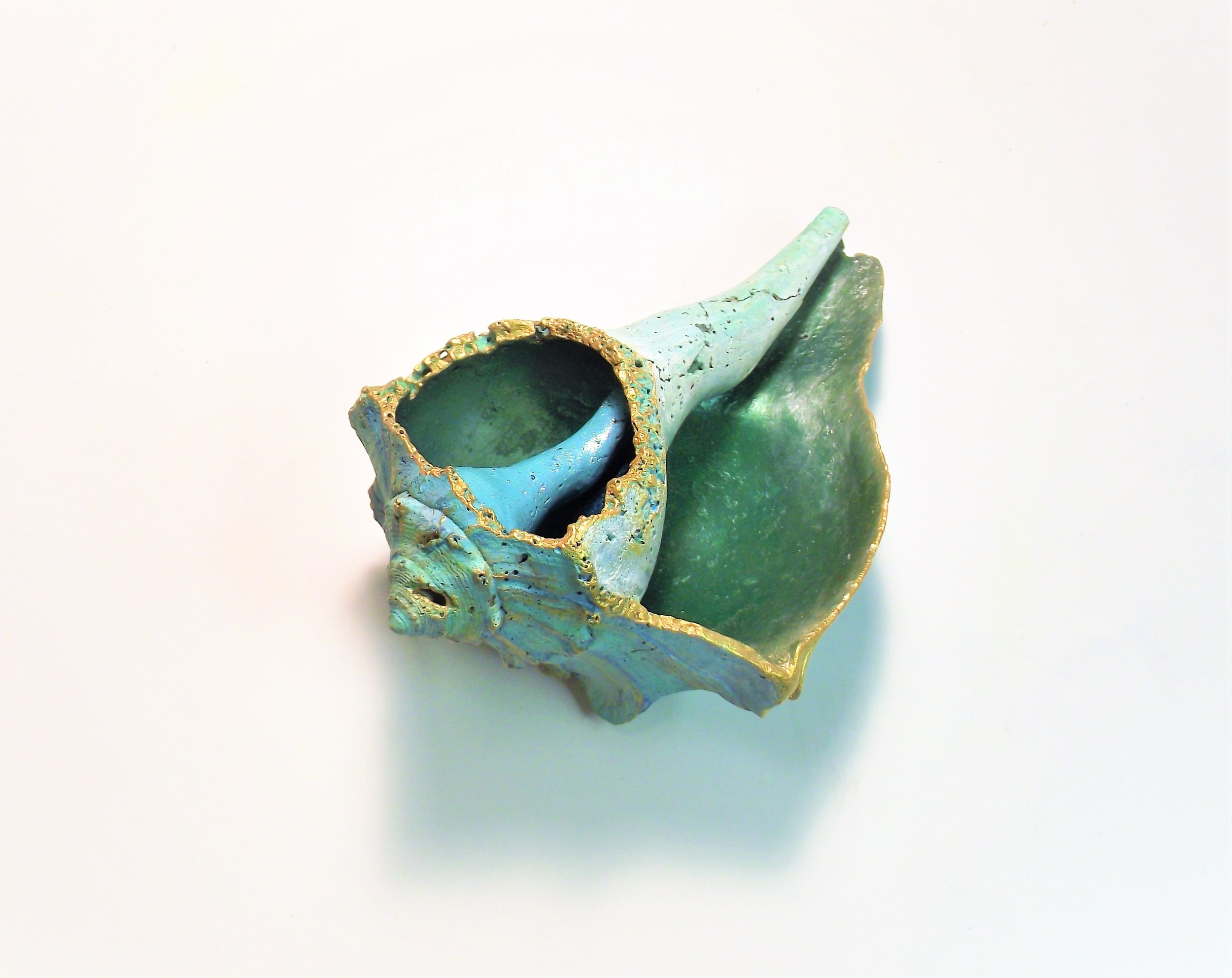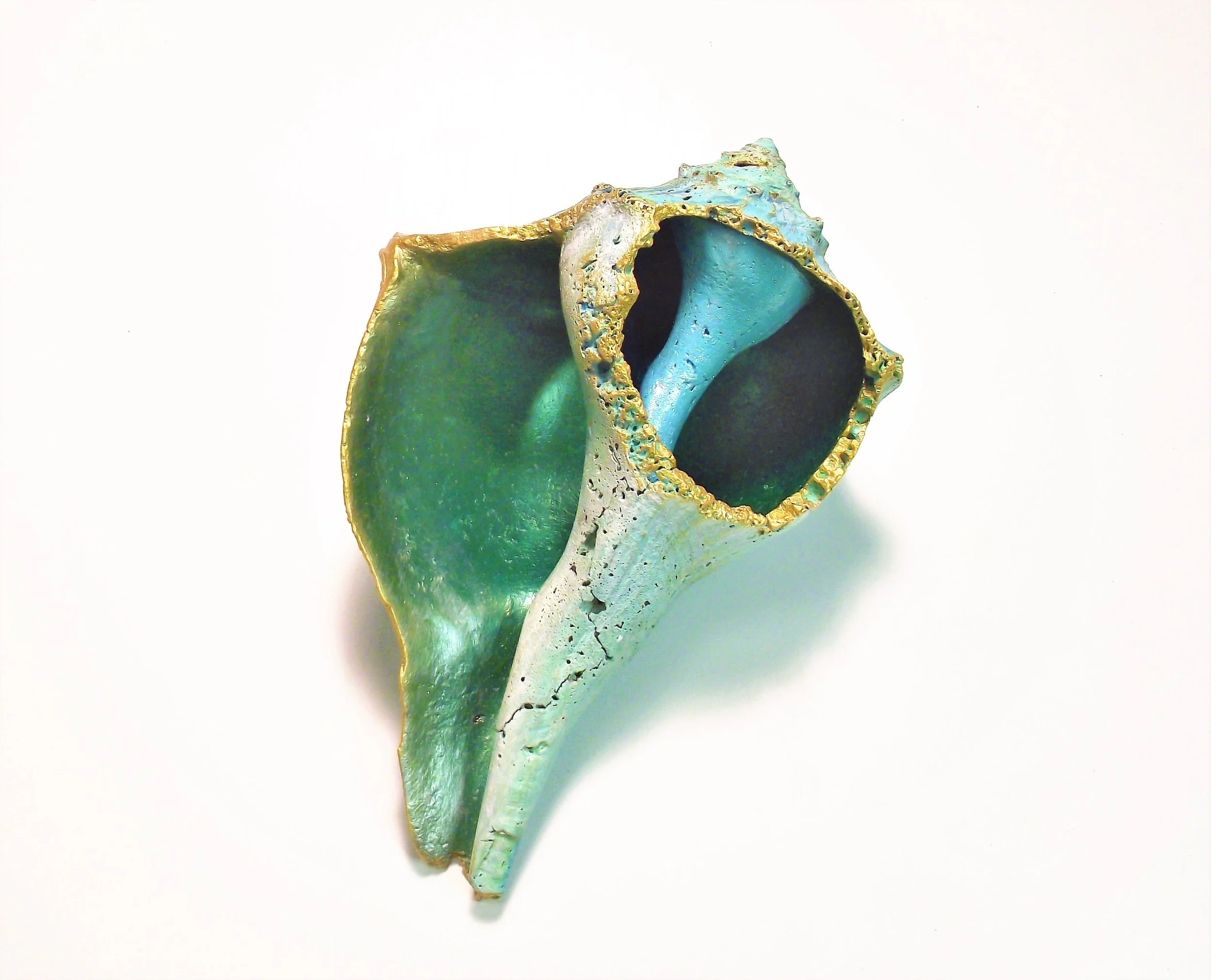 Once home for a living sea creature, this Lightning Whelk seashell was long ago abandoned and tossed on the ocean floor. Time and wind and waves and sand and sea creatures have all exerted their force upon this shell to transform it into something unique and unrepeatable. Shells, composed mostly of calcium carbonate, are surprisingly strong, yet under the power of nature, they change. ‘Unforeseen Treasures’ is a unique art piece that continues the metamorphosis of this whelk.